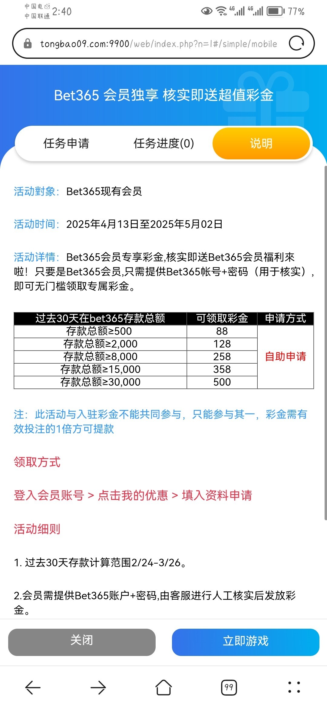 在bet365有存款的可以去撸,网址https://tongbao09.com:9900/web/mobile/#/home,我没有在bet365玩过,所以没有,但是其他彩金他都派送了