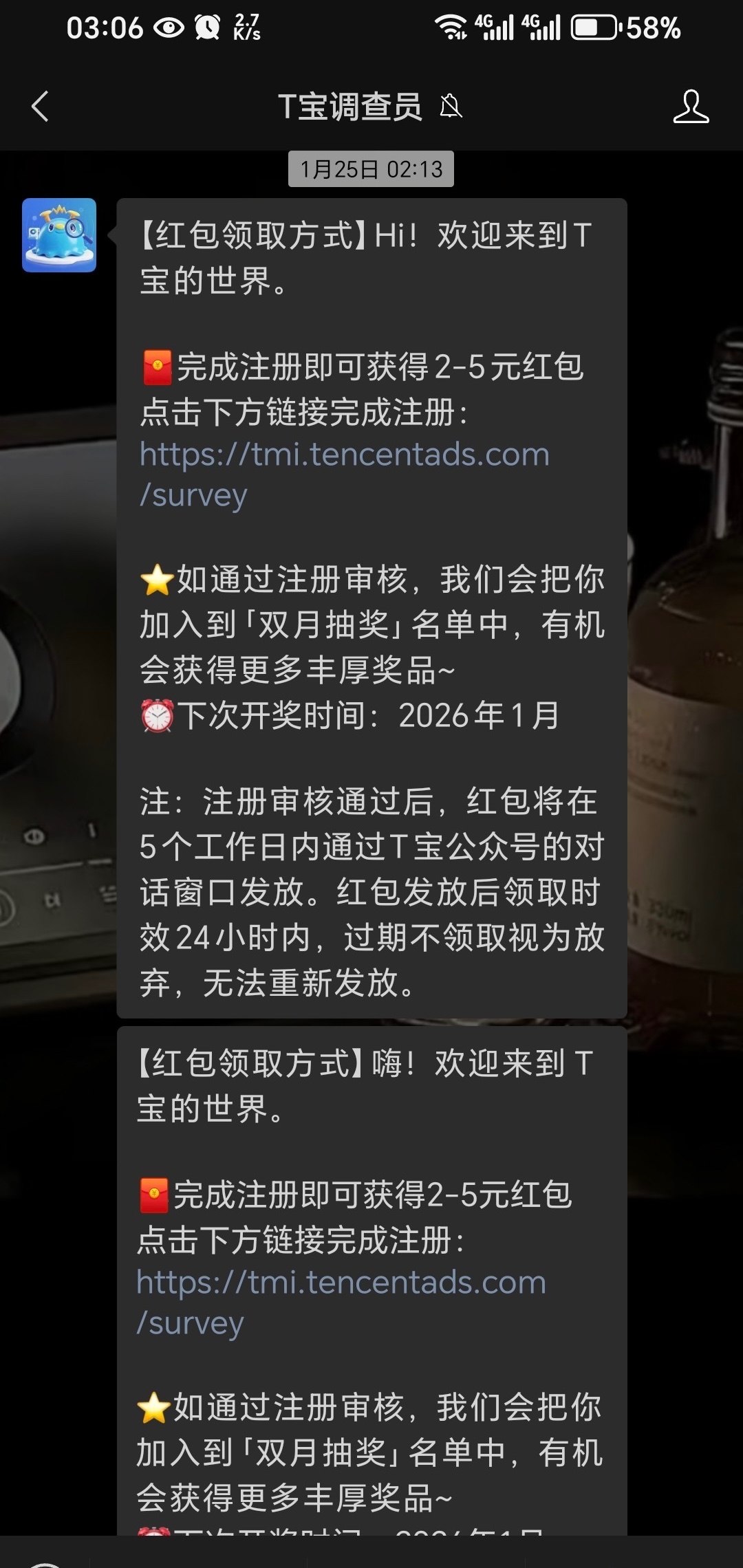 微信搜索小程序T宝调查员进去关注他会给你弹个注册链接里面只需要回答几个问题就可以了1~5天大概就1天多的样子到时候红包会发那个公众号