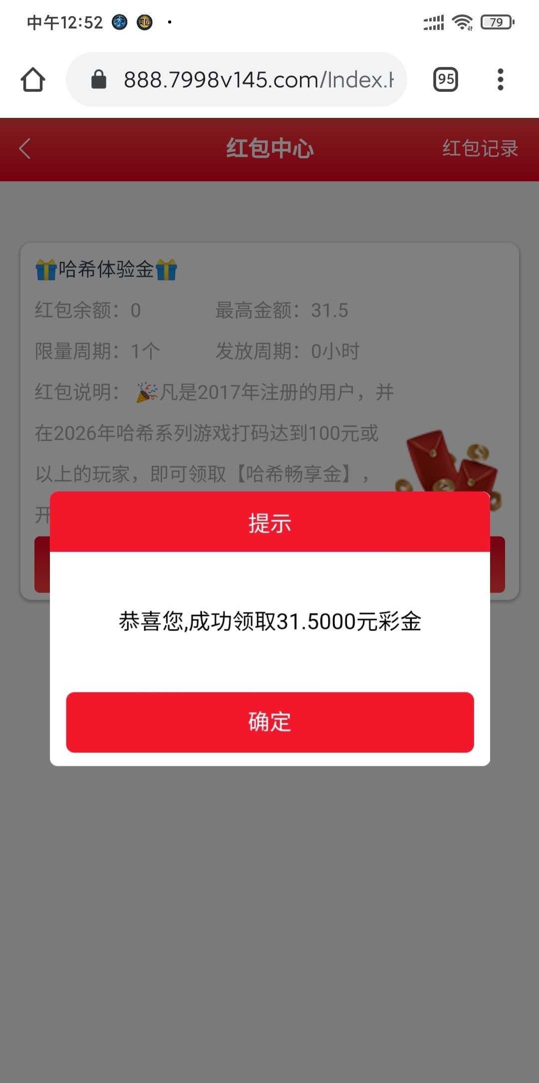 哈希系列体验金最高31.5具体是注册年份,条件要求今年哈希系列打码满一百,前段时间转盘转过高级的可以直接领取了