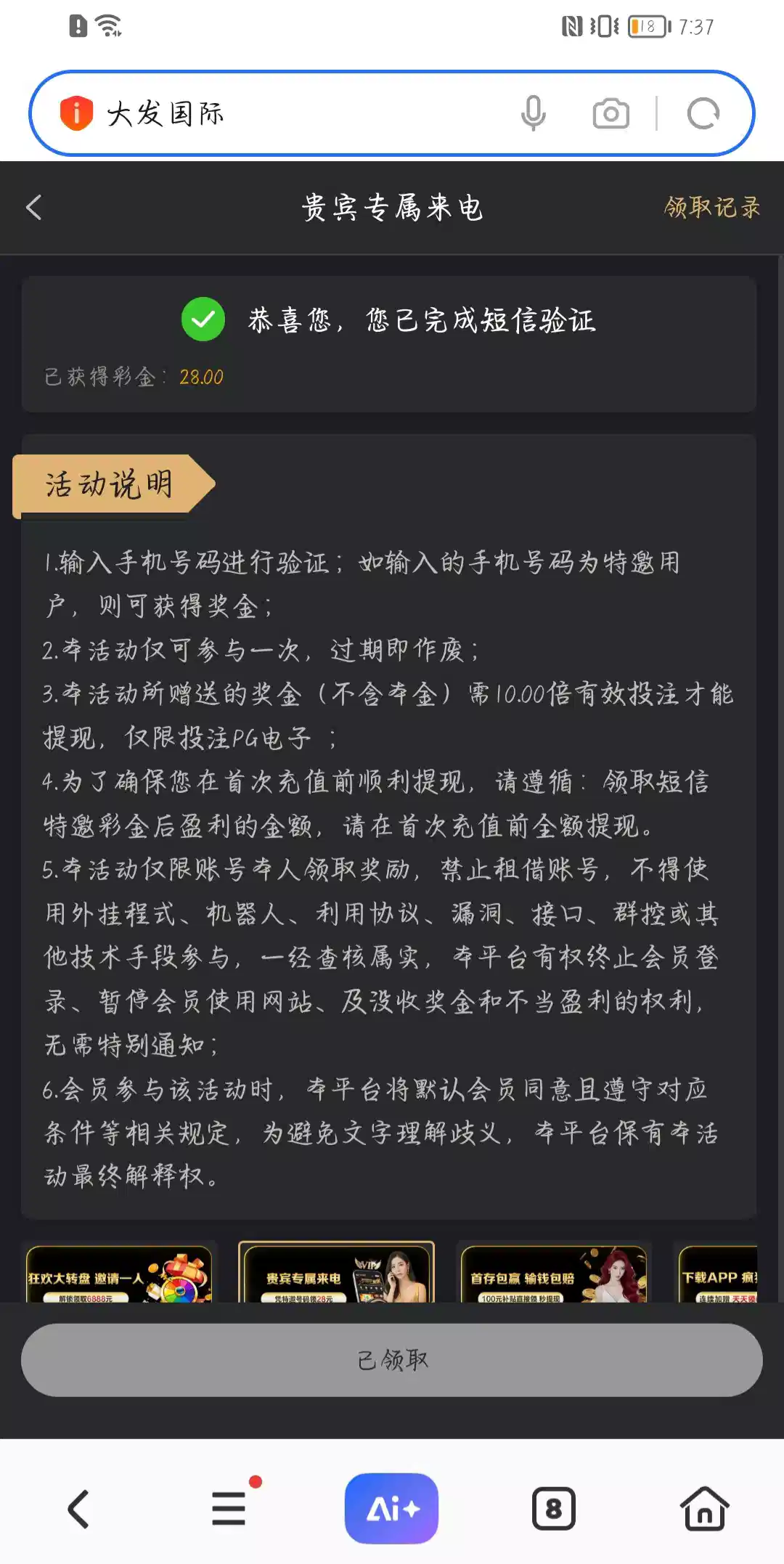 刚刚接到了电话打开网站一看寻思着前几天不是领取了嘛,然后登陆上去看看,输入号码又可以领取一次了,我有两个号码只有接到电话的这个能领,老哥么快点冲吧